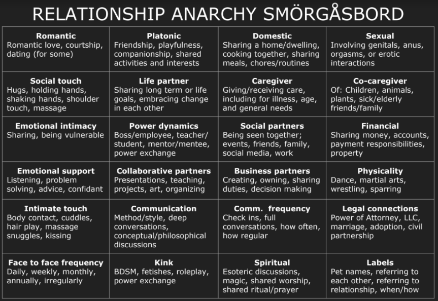 Importantly, relationship anarchists avoid putting their relationships in boxes or categorizing them with society’s labels such as “partner”, “friend” or “lover”. Instead, this structure is about breaking down societal relationship standards, as well as focusing on relationships as a community rather than as individuals in a relationship.